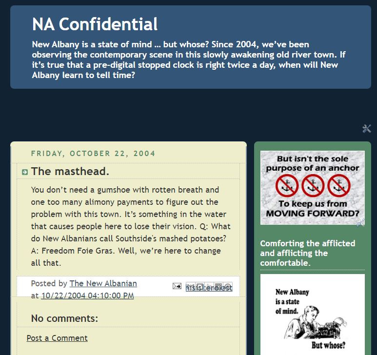 New Albany is a state of mind … but whose? Since 2004, we’ve been observing the contemporary scene in this slowly awakening old river town. If it’s true that a pre-digital stopped clock is right twice a day, when will New Albany learn to tell time?